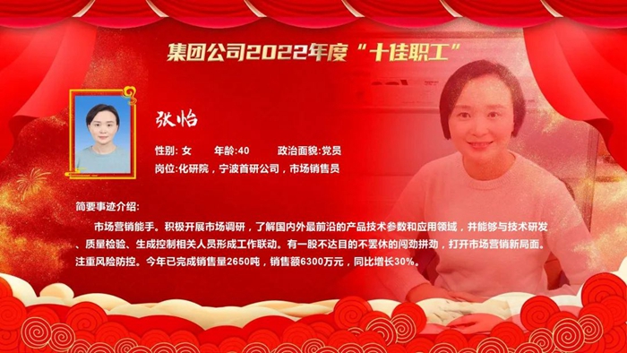 为激励苦干实干、树立身边典型、打造先进品牌,不断强化广大职工“企业发展、我有责任,拼搏‘3+1’、我在行动”主人翁意识,促进企业高质量发展,经企业推荐、广泛遴选、优中选优、民主集中、会议研究,乐玩(中国)决定,授予北京市化学工业研究院有限责任公司宁波首研公司市场销售员张怡(女)等10名同志乐玩(中国)2022年度“十佳职工”,并在乐玩(中国)二届一次职代会暨2023年度工作会上予以表彰。