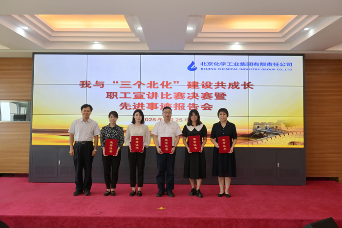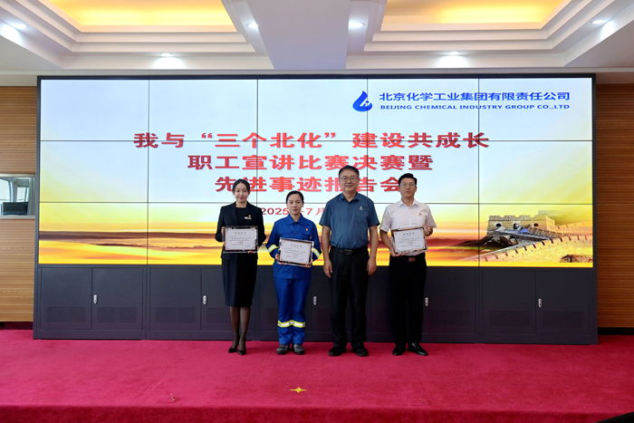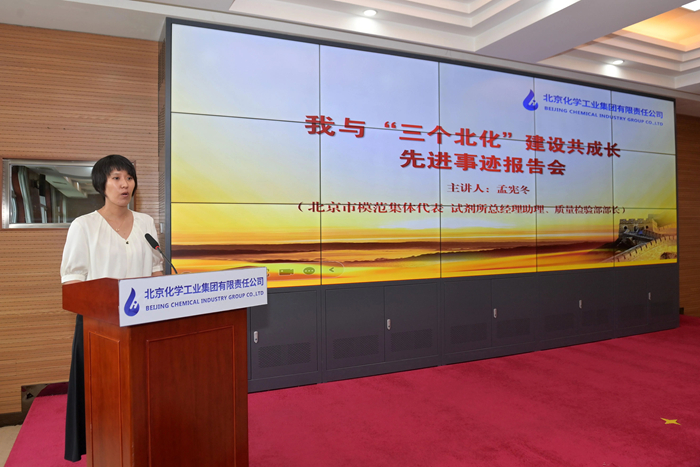 在先进事迹报告环节,市劳动模范,华腾新材总工程师崔正携《以使命为船,以热爱为帆,在时代洪流中奋勇争先》;市模范集体代表,试剂所总经理助理、质量检验部部长孟宪冬以《传承工匠精神,助力“三个北化”,试剂所质量检验部的奋进之路》为题,围绕个人成长、科研开发、团队建设,自信讲述与北京化工共同成长的点点滴滴。