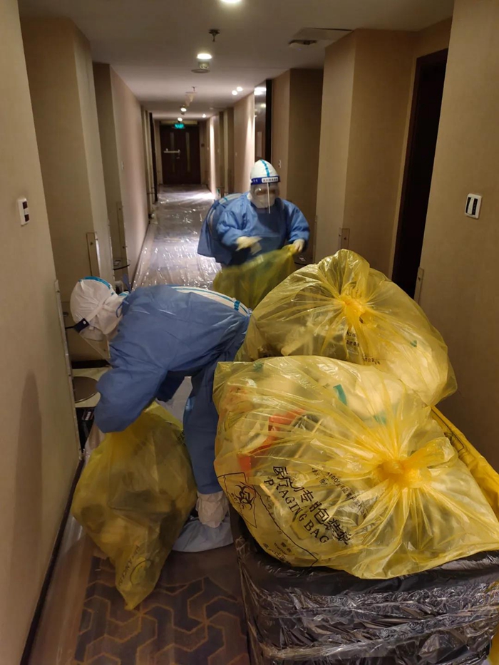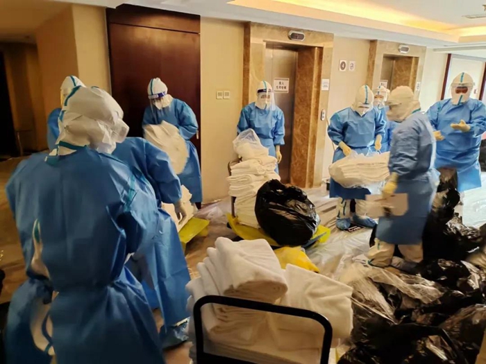 困难和挑战首先体现在前台入住、离店手续、客房清洁的工作流程的较大变化上。前台每次接到指挥部通知即将有新隔离人员入住或隔离人员解除隔离时,他们都需要全副武装穿上防护服在前台等候。每天都有隔离人员解除隔离,离开酒店后,消杀组会对客房、公共区域进行全面消毒。客房服务组在隔离人员退房后,对所有隔离人员使用的物品严格按照感染性废物进行处理,处理完毕后重新打扫恢复房间使用,这对于从未从事过医疗行业的员工来讲,是一种全新挑战,在接受了医护人员的紧急培训后,他们严格履行操作流程,对100多个房间进行了打扫翻房处理,保证了后续隔离观察人员的顺利入住。