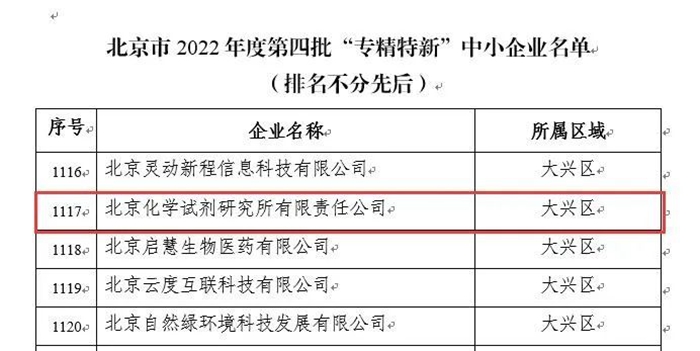 近日,北京市经济和信息化局公布了北京市2022年度第四批北京市“专精特新”中小企业名单,乐玩(中国)所属北京化学试剂研究所有限责任公司榜上有名。至此,乐玩(中国)已有华腾新材、华腾橡塑以及所属瑞京公司、华腾冀春所属冀春新材料公司、试剂所共5家企业成为省市级“专精特新”企业。