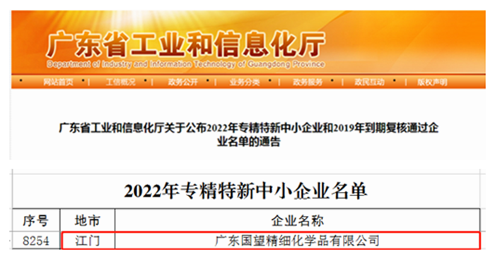 春节前夕,从广东传来好消息,华腾新材所属广东国望精细化学品有限公司成功入选广东省2022年“专精特新”中小企业名单,成为乐玩(中国)第6家“专精特新”企业。