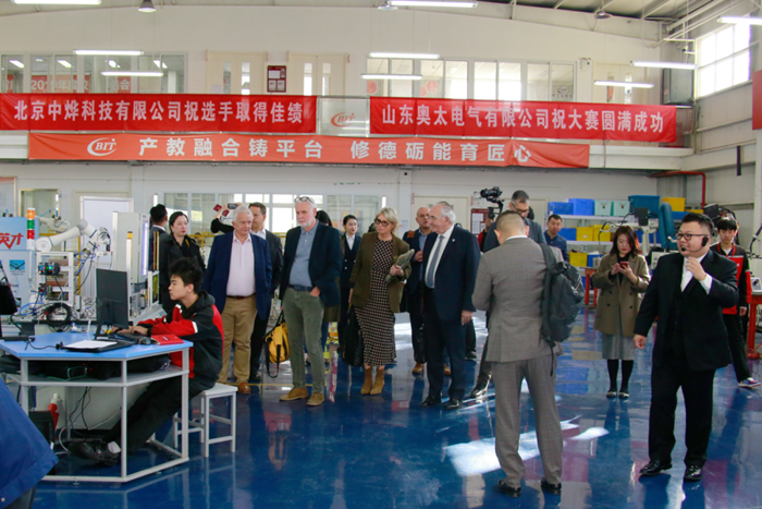 按照精心设计的接待路线,英国职业技能访问团一行先后来到学院数控车间、数控世赛基地、文物修复实训室等多个教学场所参观。