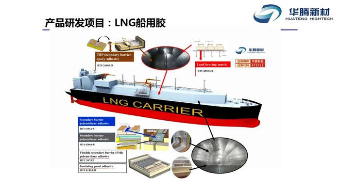 “十四五”期间,华腾新材在深耕传统胶粘剂市场基础上,直面LNG船用胶这一“卡脖子”技术难题,以高端新材料“破题”为抓手,以产业迭代为目标,将LNG船用胶作为解决自主替代难题,大胆突破,开拓新市场的重点科研项目。2023年,经过科研人员多年全力攻关,华腾新材LNG船用胶产品取得重要突破,其中绝缘板用聚氨酯胶粘剂成功通过法国GTT公司认证,并顺利投入商业化生产。